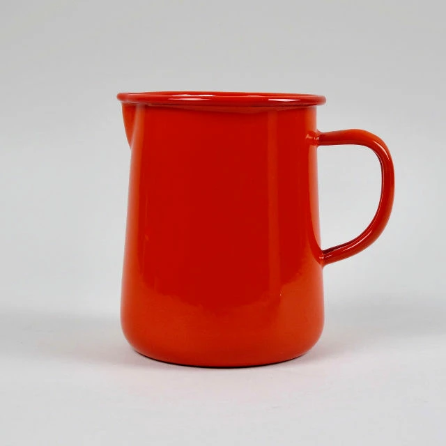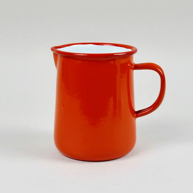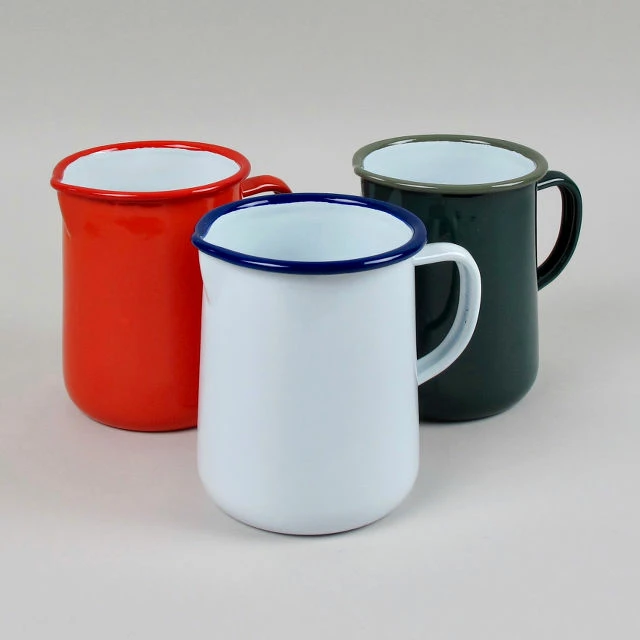 These enamel jugs from the revived Falcon Enamelware brand are available from us in 3 colours: pillarbox red, samphire green and white with a blue border. The jugs are plain white on the inside and have the Falcon logo to the underside.