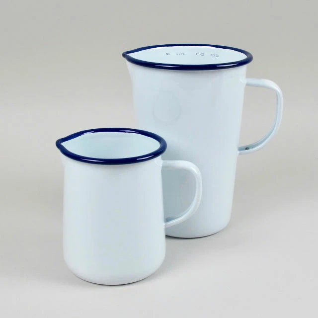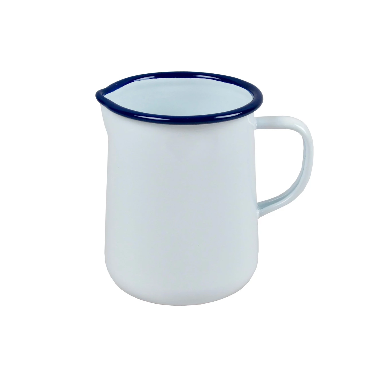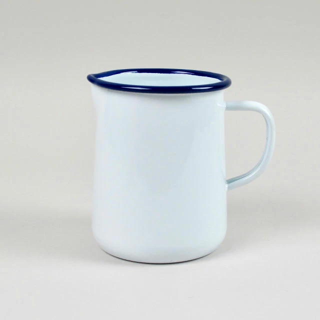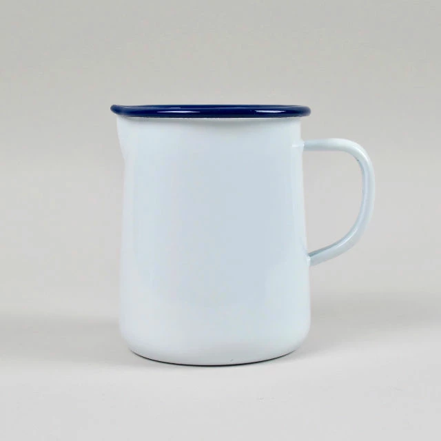 These enamel jugs from the revived Falcon Enamelware brand are available from us in 3 colours: pillarbox red, samphire green and white with a blue border. The jugs are plain white on the inside and have the Falcon logo to the underside.