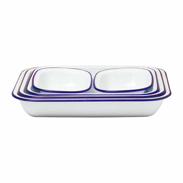 A five-piece enamelware bake set, capable of handling anything from a whole roast turkey to a heartwarming lasagne served straight from the oven. This set contains 1 x 37 cm bake pan 1 x 34 cm bake pan 1 x 31 cm bake pan 2 x 20 cm pie dishes Oven-safe up to 530F / 270C Dishwasher safe Freezer friendly Suitable for gas and electric hobs Not safe for microwaves Chemically safe How can I clean my Falcon Enamelware? Lemon juice can remove stains from Falcon enamelware products, such as tea stains on mugs. Soaking the products in warm soapy water will help remove baked on food, but avoid using abrasive sponges or brushes as this may scratch the surface. Coating your pans in a light layer of oil before cooking can help with cleaning after use. If my enamelware chips can I still use it? Yes. Just like any other ceramic, the outer porcelain layer can chip if dropped, revealing the steel beneath it. When this happens the steel below naturally oxidises and the enamelware remains safe to use. Plus, in our opinion, it gains a little more character.