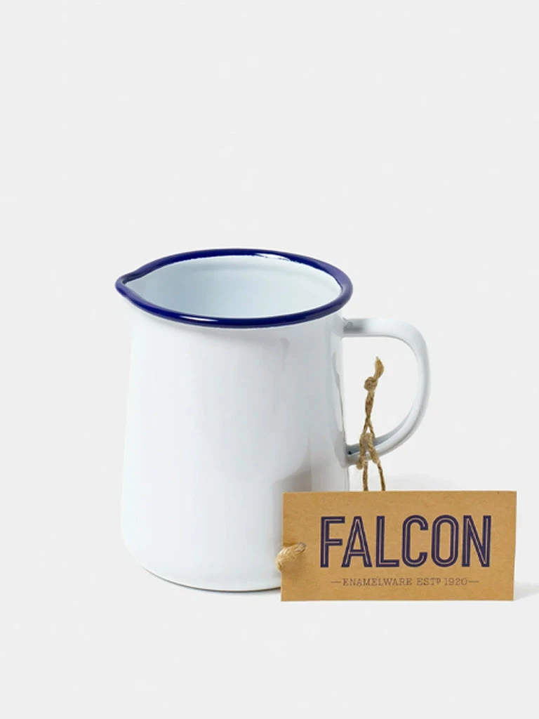 The 1 Pint Jug from Falcon Enamelware is a great addition to a tabletop spread, useful for pouring sauces and drinks. Comes in original white with a blue rim. 1 Pint Jugs are 11 cm tall and hold 586 ml. Care & Use Oven safe up to 270c Dishwasher safe Freezer friendly Suitable for gas and electric hobs Not safe for microwaves Chemically safe
