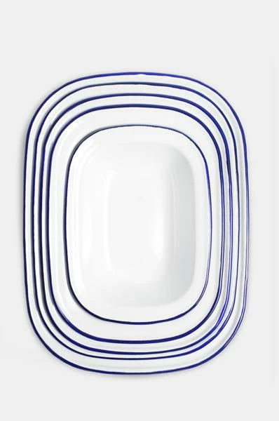 A five-piece enamelware pie set in white with blue trim, from the iconic British brand ‘Falcon’. This set contains: 1 x 30cm pie dish, 1 x 28cm pie dish, 1 x 26cm pie dish, 1 x 24cm pie dish, 1 x 20cm pie dish. The Falcon range is safe for oven, gas and electric hob use. Enamelware cannot be used in the microwave. If the outer porcelain layer is chipped, the steel beneath it naturally oxidises and the enamelware remains safe to use.