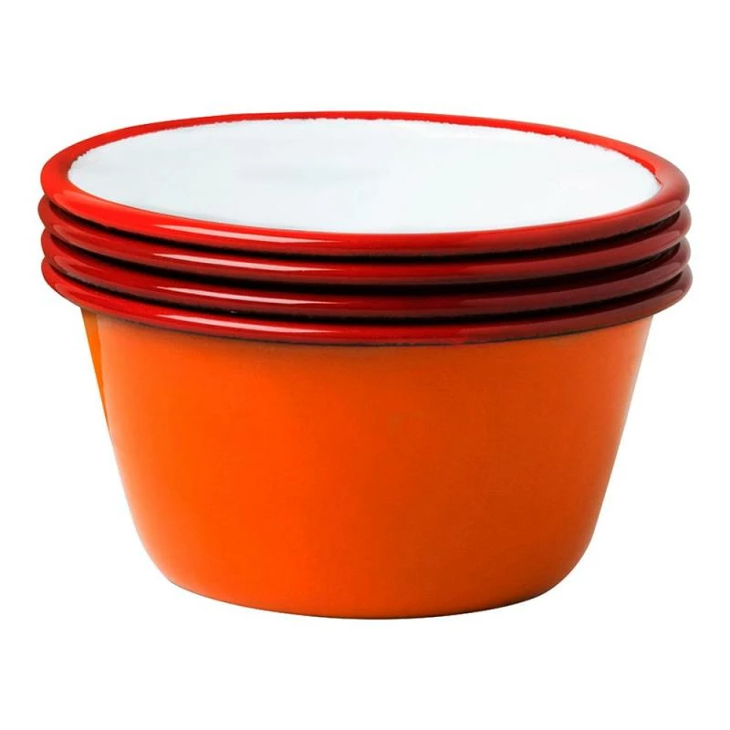 Serve all kinds of culinary creations in style with this set of four bowls from Falcon. Great for creating individual cakes or casseroles, this set is made from cool white glaze with colored bases and edges. Suitable for use in gas and electric ovens and ranges, it is wonderfully practical and is also freezer and dishwasher safe. It is recommended to avoid the use of abrasive sponges or brushes so as not to scratch the surface, however, if the bowls chip after prolonged use, their use is still perfectly safe. Set of four bowls Material: enamelled steel Dimensions: 12cm Capacity: 465ml Cool white enamel bowls With a contrasting blue border Oven safe up to 270 C Suitable for use on gas and electric cooktops