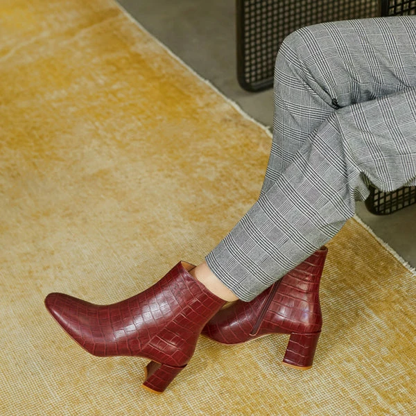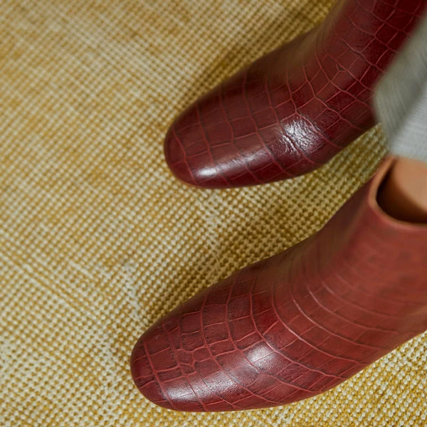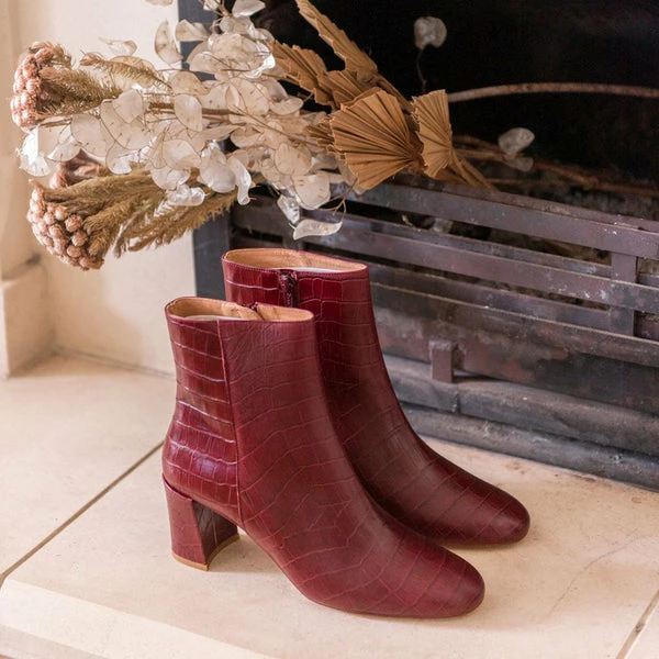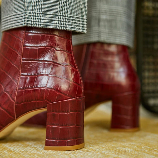 Add a subtle splash of seasonal colour to your autumn and winter wardrobe with these beautiful, women’s ankle boots from Petite Mendigote. Crafted from a dark red cow leather with a crocodile skin texture, they feature a 5cm heel, perfect for adding a little height whilst still remaining comfortable enough for everyday wear. The smooth, simple lines give an elegant look, perfect paired with tailored trousers or floaty dresses. Cherry Red Claudette Croco Leather Ankle Boots from Petite Mendigote. Made from cow leather. 5cm heel. Clean with a leather brush. Store with a shoe tree or tissue paper to preserve the shape. Season: Autumn / Winter 2020.