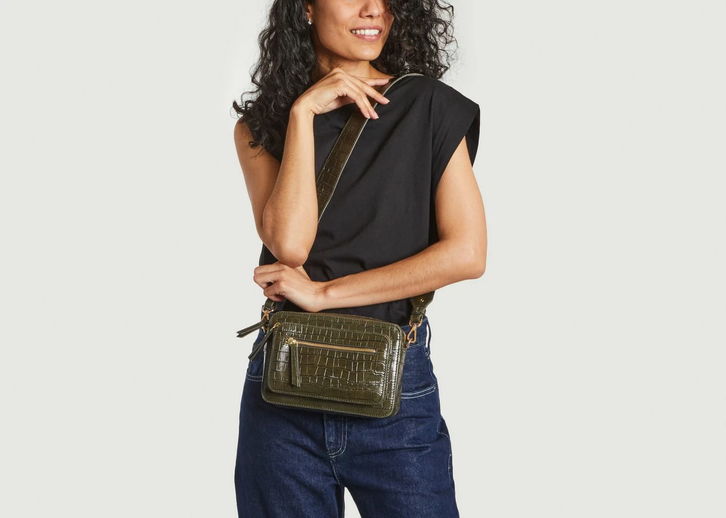 Khaki crocodile leather bag, cotton lining, zipped closure on the top, double zipped pocket on the front, removable shoulder strap for carrying on the shoulder/cross body. For a trendy look, fall for the Jimmy bag from Petite Mendigote ! We like its timeless animal pattern. Its medium size will be very practical for the everyday life.