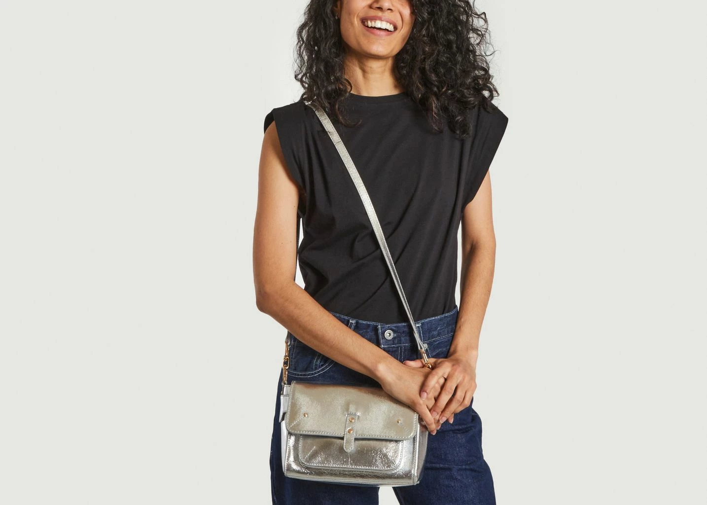 Supple silver metallic cowhide bag, cotton lining, front flap with tab, golden studs and magnetic closure, 2 patch pockets, one in front and one in the back and one inside pocket, shoulder strap for carrying on the shoulder or across the chest. Choose the Ezekiel bag from Petite Mendigote! It is both casual with its shape and glamorous with its bright color full of pep. With its medium size, it will be perfect for everyday use.