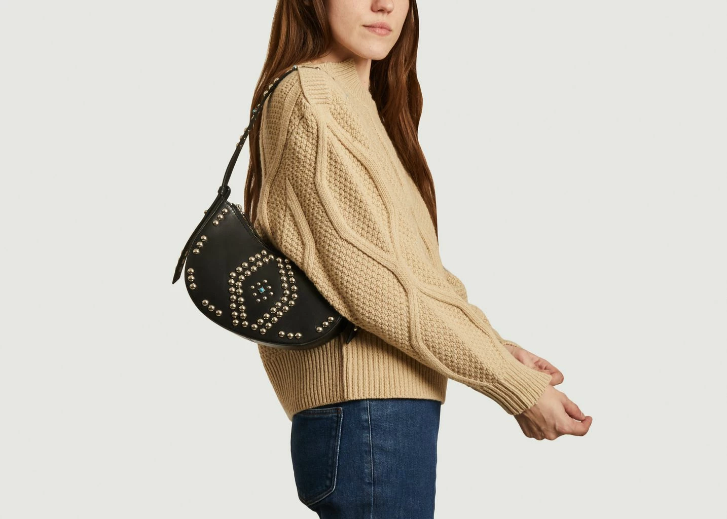 Black cowhide bag with an adjustable smooth leather handle, a zip fastening on top and pretty bead details all over the front and the handle. Pretty little blue stone on the front in the middle. I love this beautiful leather bag by Petite Mendigote. Here, the brand revisits in its own way the very trendy baguette by adding a bohemian/rock touch. Wear it with a black dress and leather boots, it will make an immediate impact!