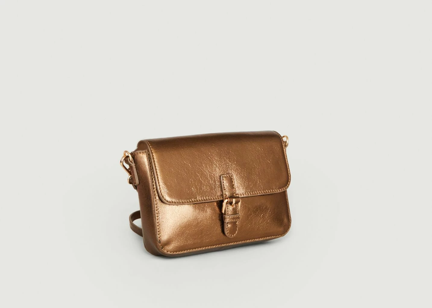 Bronze metallic cowhide leather messenger bag, removable shoulder/cross-body strap, front flap with belted tab closure, embossed logo on the back, cotton lining. Choose the Hyperion bag by Petite Mendigote! We like its bright color full of pep which energizes its simple lines. Its medium size will be very practical for the everyday life.