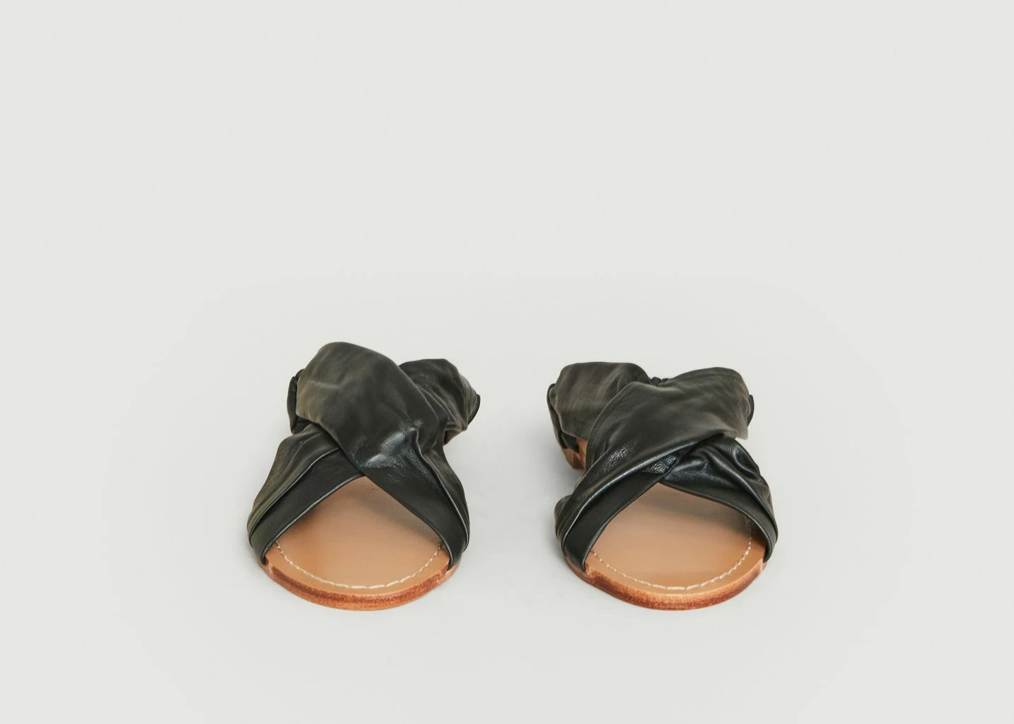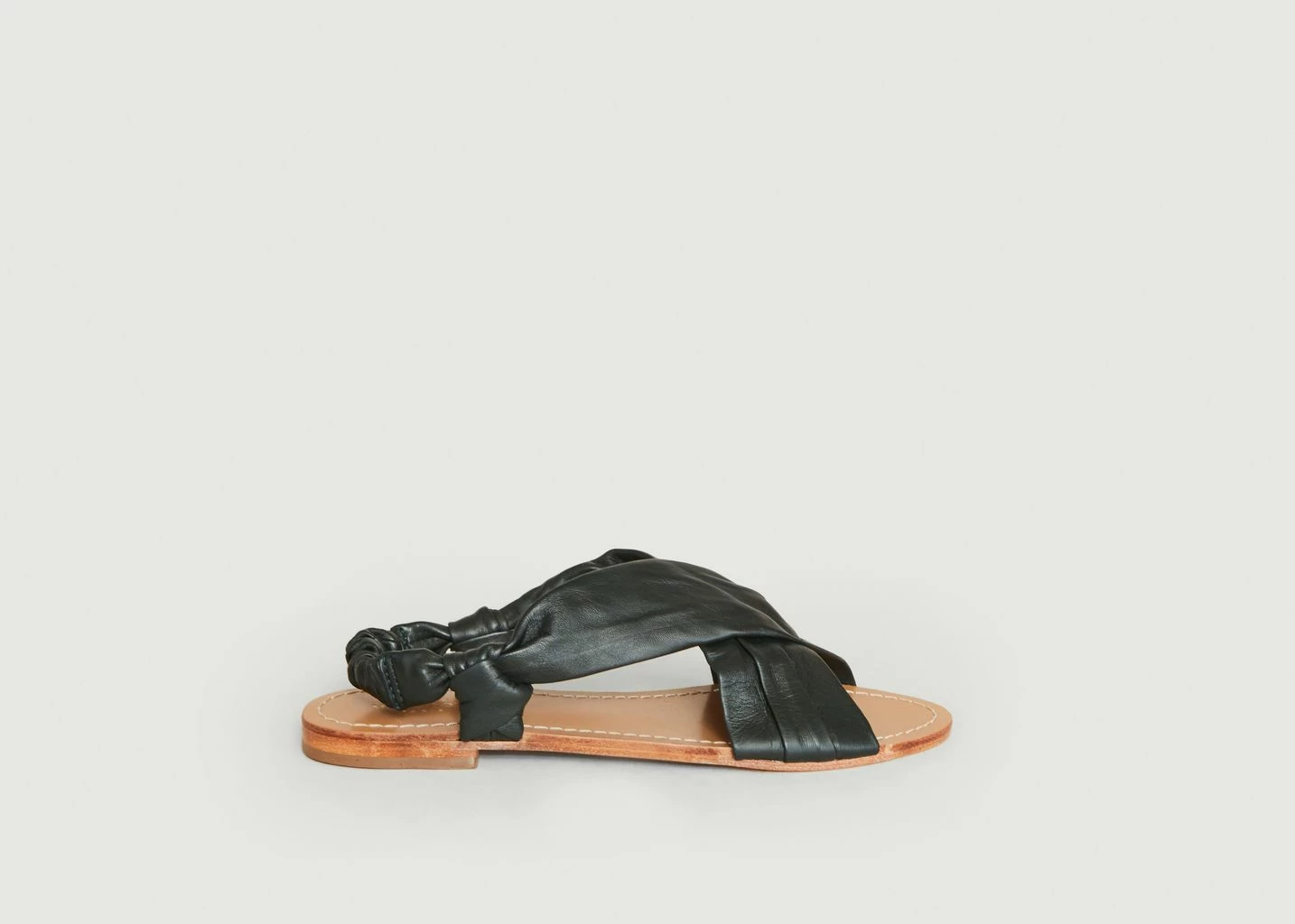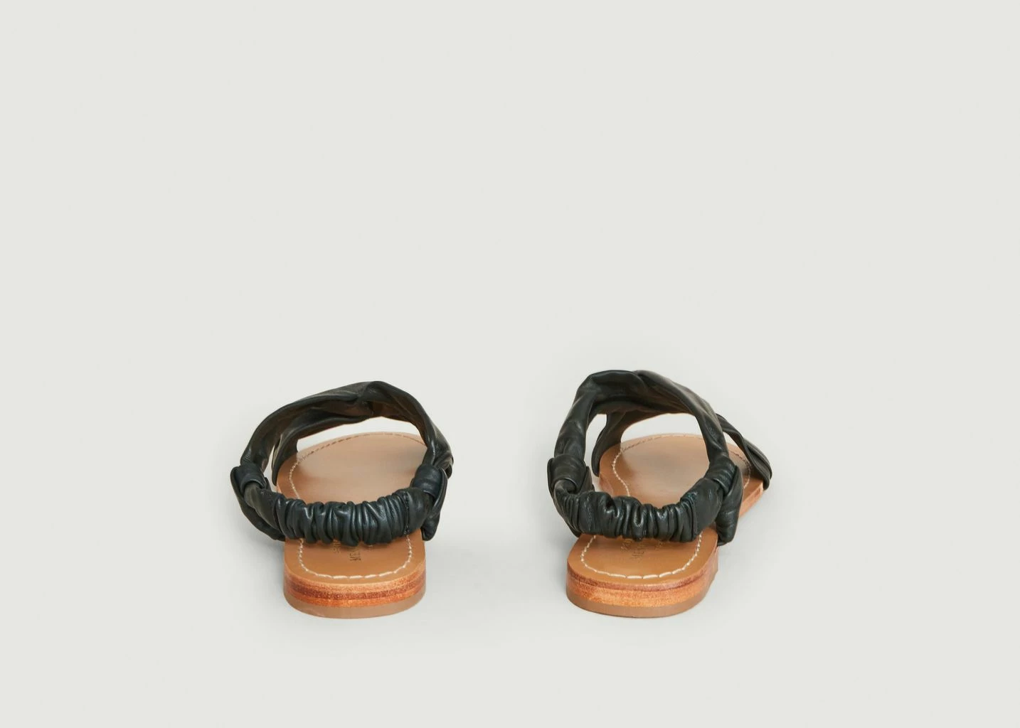 Forest green flat sandals in nappa leather, wide flexible straps crossed at the front of the foot, elasticated strap to hold the foot in place. Don’t hesitate to wear the Jill sandals by Petite Mendigote ! We like these shoes both elegant and casual, easy to put on. They will be worn all summer long with pants or dresses.