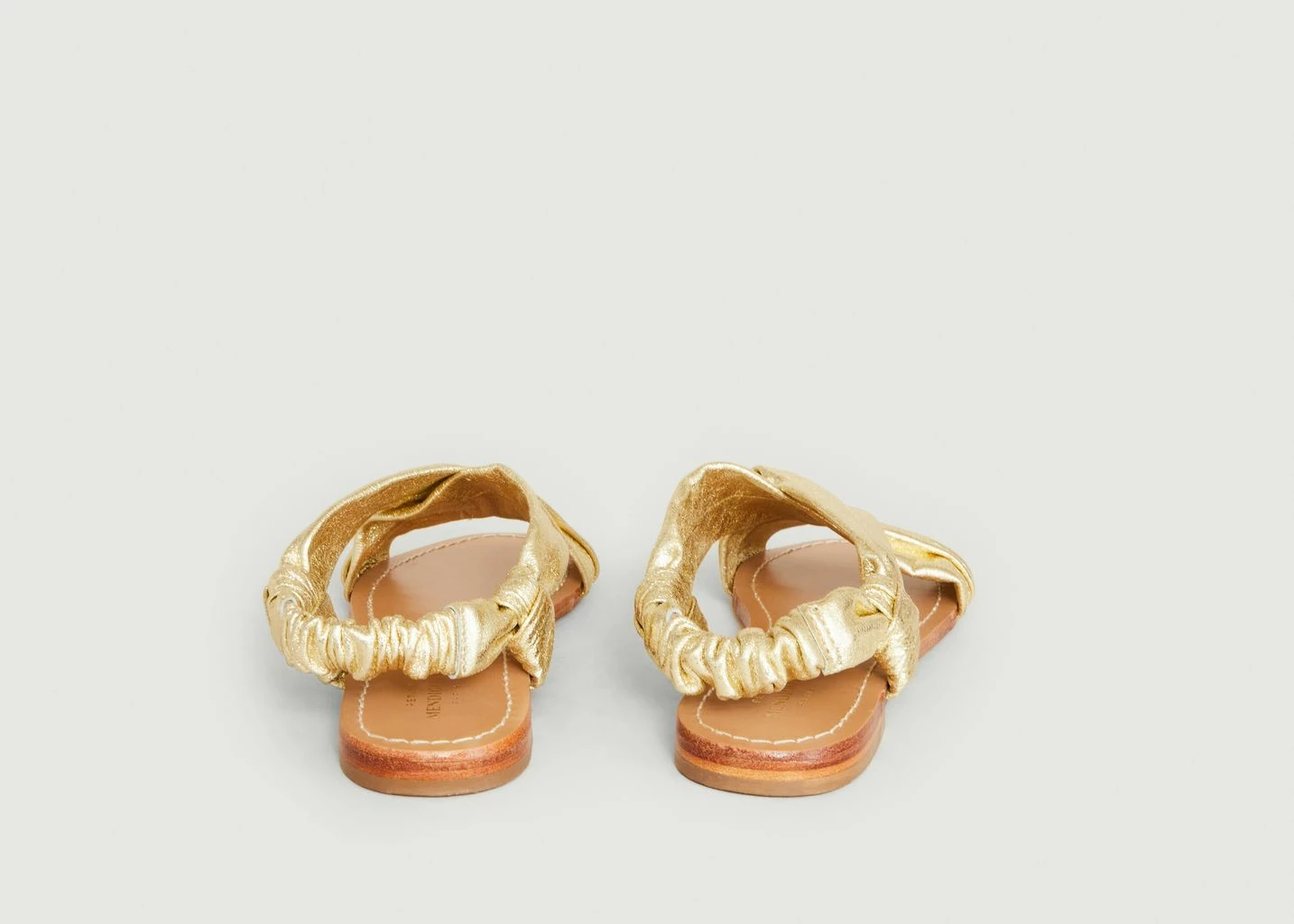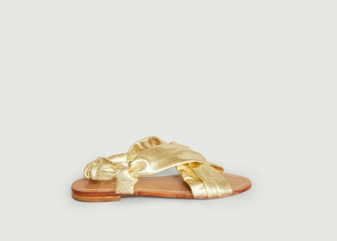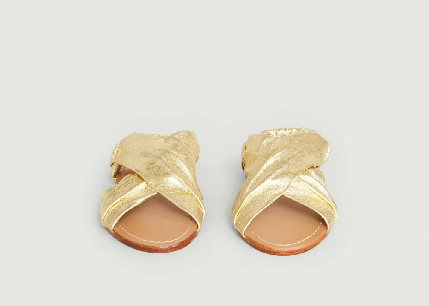 Flat sandals in gold metallic leather, wide flexible straps crossed at the front of the foot, elasticated strap to hold the foot in place. Fall for the Jill sandals by Petite Mendigote ! We like the shiny color which energizes these shoes with timeless lines. These easy to slip on sandals will be worn during the day or in the evening.