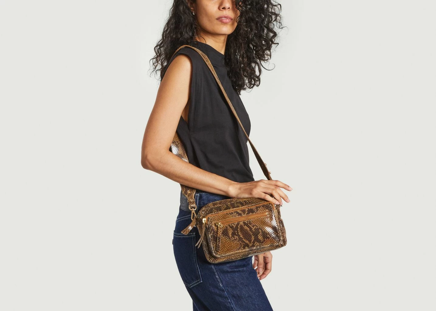 Brown python style cowhide leather bag, cotton lining, zipped closure on the top, double zipped pocket on the front, removable shoulder strap for carrying on the shoulder/cross-over. For a trendy look, fall for the Jimmy bag from Petite Mendigote ! We like its timeless animal pattern. Its medium size will be very practical for the everyday life.
