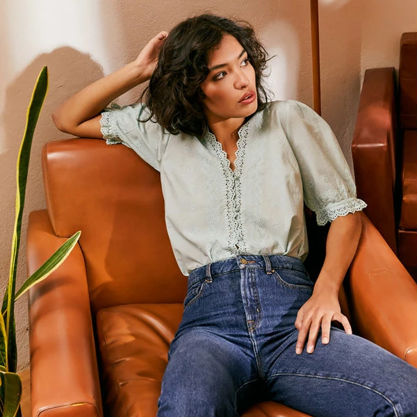 Crafted from 100% organic cotton, this pretty shirt was designed in Paris by women’s fashion brand Petite Mendigote. Featuring short sleeves, a v-neck, button-down front with pearl buttons, openwork trim, and embroidery details throughout, this looks lovely styled with high waisted jeans, for an elevated everyday look. Melodie Celadon Blouse Top from Petite Mendigote. Made from 100% Organic cotton. Machine wash at 30°C. Do not bleach. Iron at low temperature on the reverse. Do not tumble dry. For a size Small – Total length: 57 cm, 1/2 Chest circumference: 44 cm, Sleeve length: 31 cm, Total shoulder length: 36 cm. Season: Spring / Summer 2022. Organic Cotton: Made from organic cotton, from organic farming. Grown with respect for people and the environment, without chemical fertilisers or pesticides, it requires less water than traditional cotton.