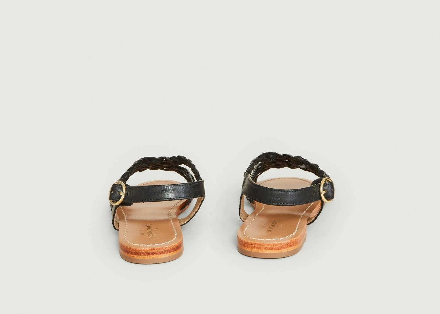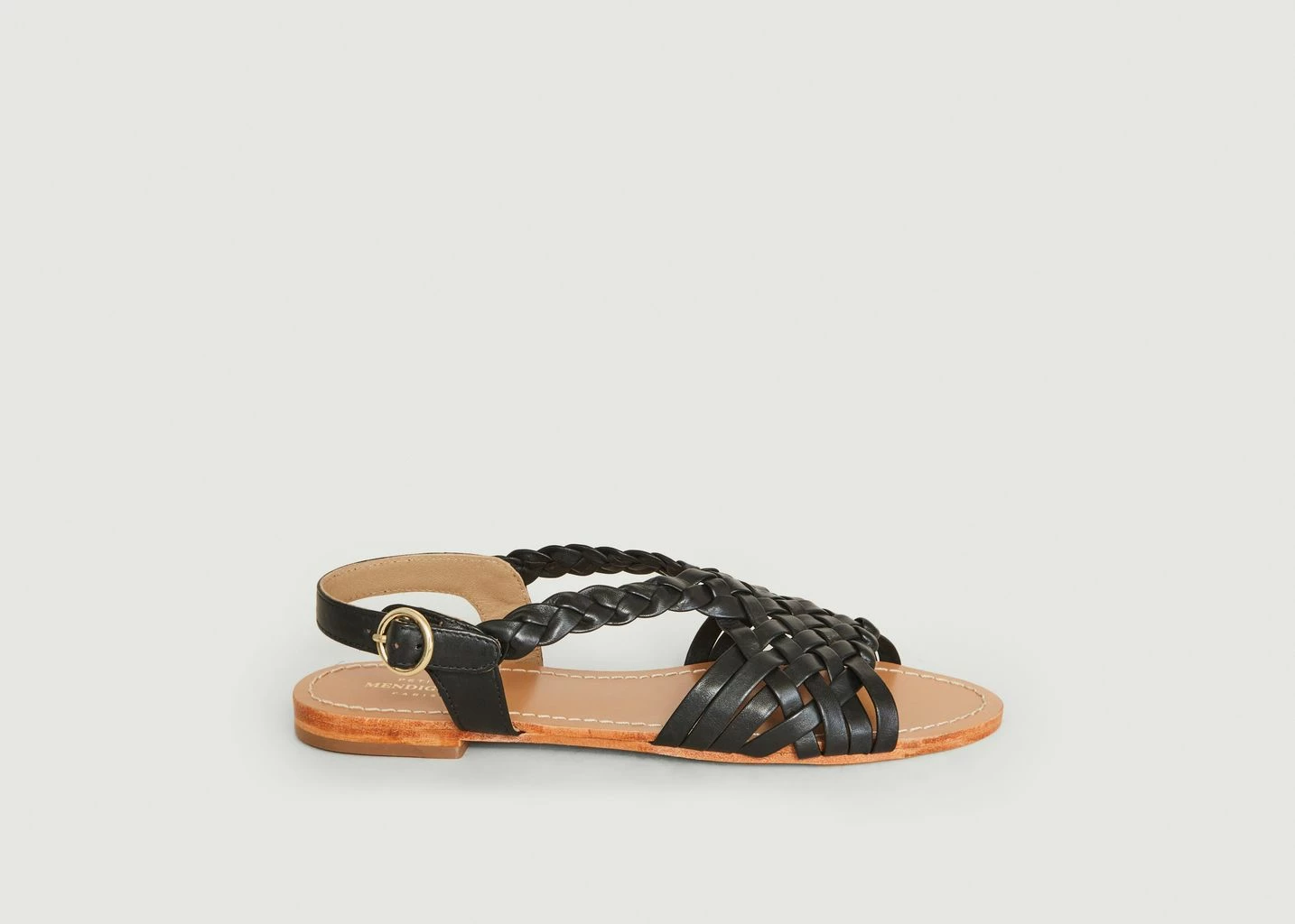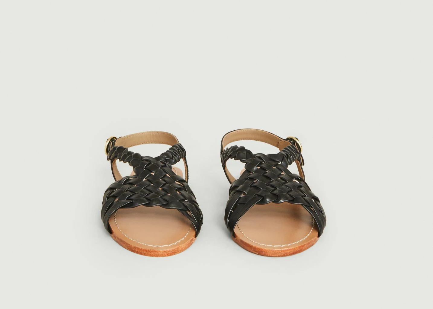 Black sandals, made of leather. Featuring medium heels, open toe, wide braided straps, stitching, buckle closure at the ankle, multi-strap. Opt for these sandals that give you a distinguished and vintage style, perfect for the summer period. They highlight your feet in the best way with a simplicity and finesse brought by the straps. Pair them with a floral midi dress.