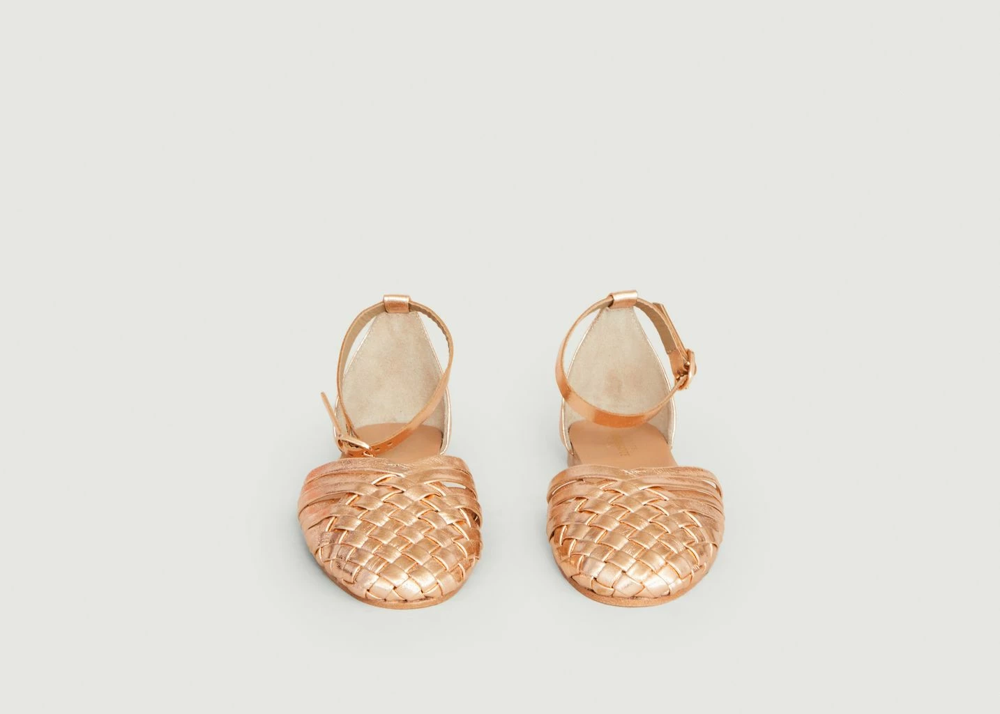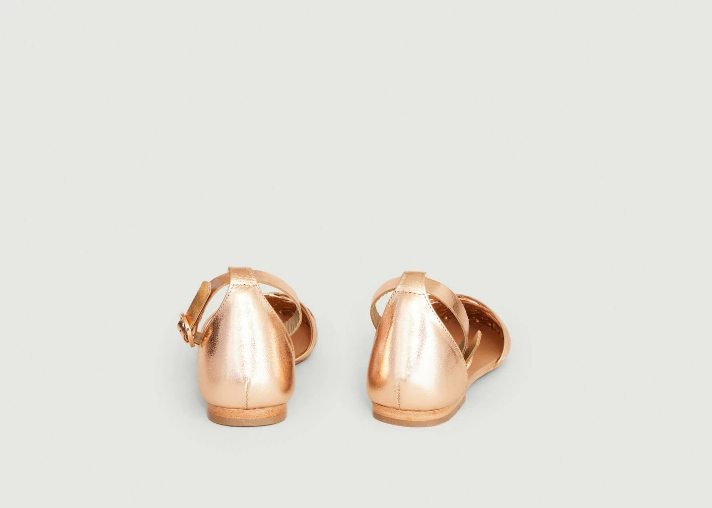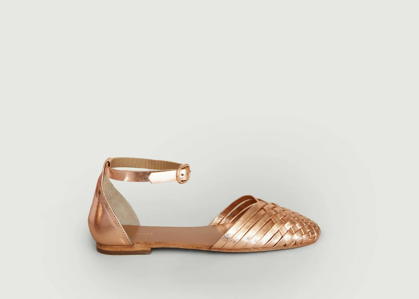 Flat sandals in powder pink metallic leather, covered shape braided at the front of the foot and at the heel, thin strap with adjustable closure around the ankle. Fall for the Piccolo sandals by Petite Mendigote ! We love these shoes both retro by the cut and glamorous by the bright color full of pep. These sandals will be ideal for an evening with dressy pants or a short dress.