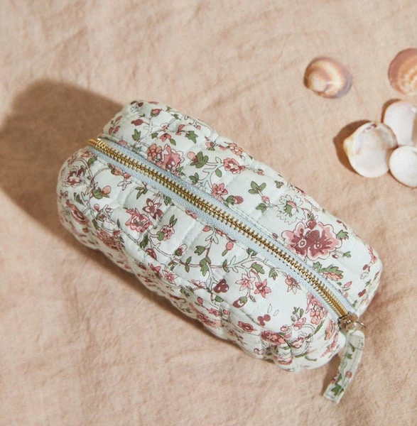 Small quilted case. Floral print. One compartment with a zipper and a small patch pocket inside. 10,5 x 17 x 7 cm