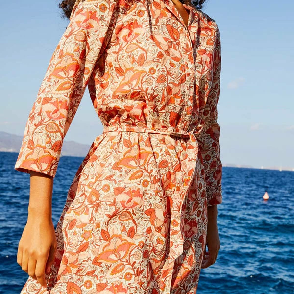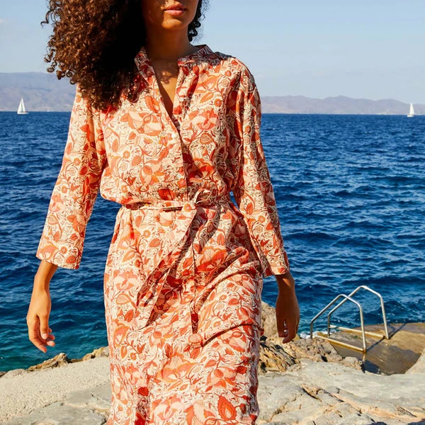 Designed in Paris by women’s fashion brand Petite Mendigote, this pretty kaftan inspired dress has been crafted from 100% organic cotton in an all-over, warm toned floral print. Featuring long sleeves, a Mao collar, and a button-down front, this is the perfect throw-on-and-go style for summer. Simply pair with sandals and a basket bag for a chic, everyday look. Tamara Clematite Orange Dress from Petite Mendigote. Made from 100% Cotton. Delicate machine wash – Max 30°C. Do not bleach. Iron on low. Do not tumble dry. For a size Small: Total length: 132cm, half chest circumference 50cm, shoulder length: 13cm, sleeve length: 42cm. Season: Spring/Summer 2022. Organic Cotton: Article made in organic cotton, from organic farming, grown with respect for people and the environment, without the use of chemical fertilisers or pesticides. A process that requires less water than traditional cotton.