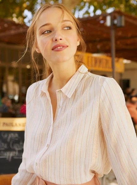 Lurex shirt with button front and double buttoned cuffs 90% cotton 10% lurex Made in India Machine wash at 30 Do not bleach or tumble dry Iron inside out