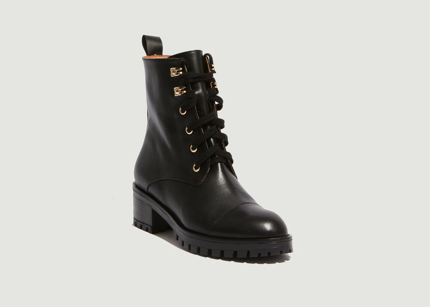 Black smooth leather boots, round toe, tone-on-tone lace under 4 eyelets and 2 metal fasteners in a mountain shoe style, boot-pull tab on the back, thick notched sole.