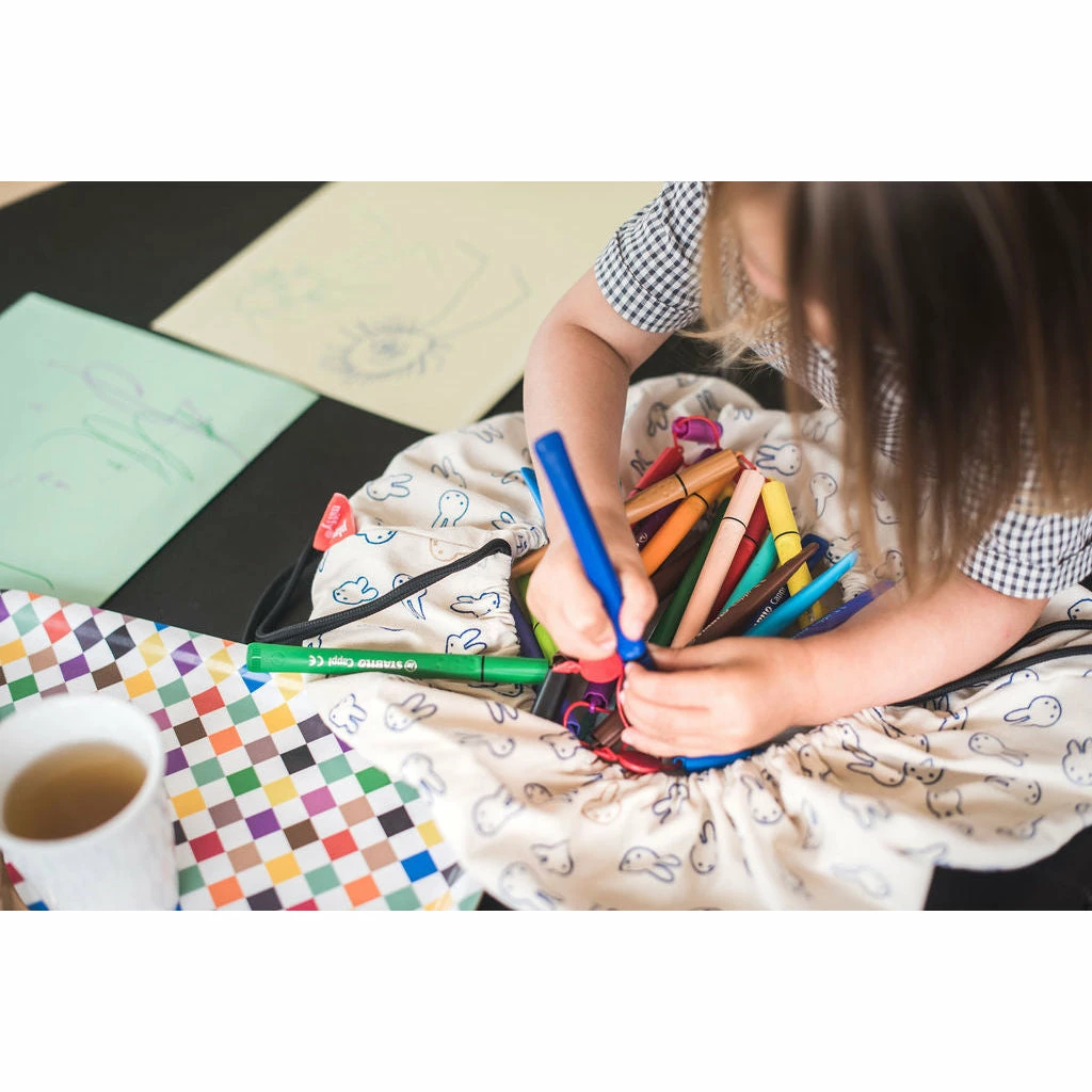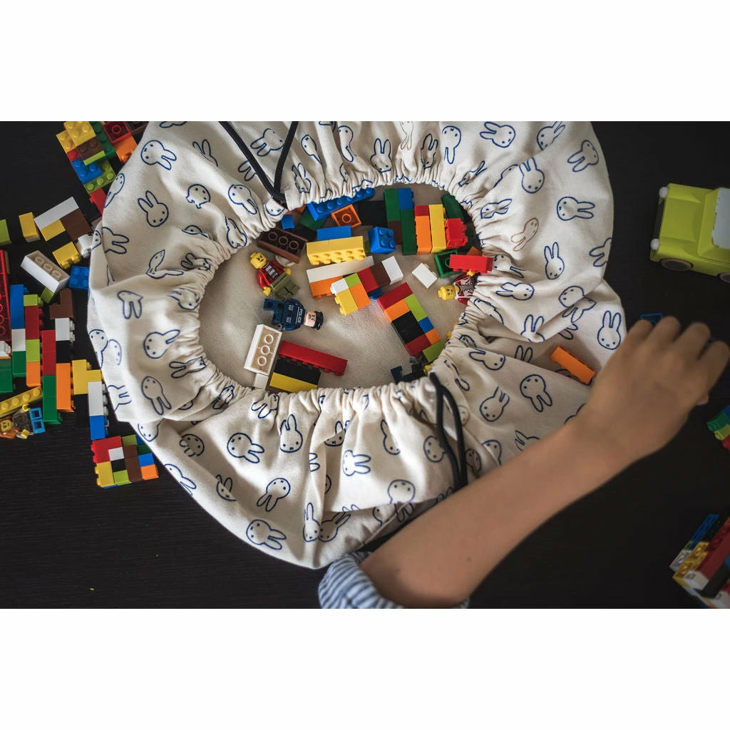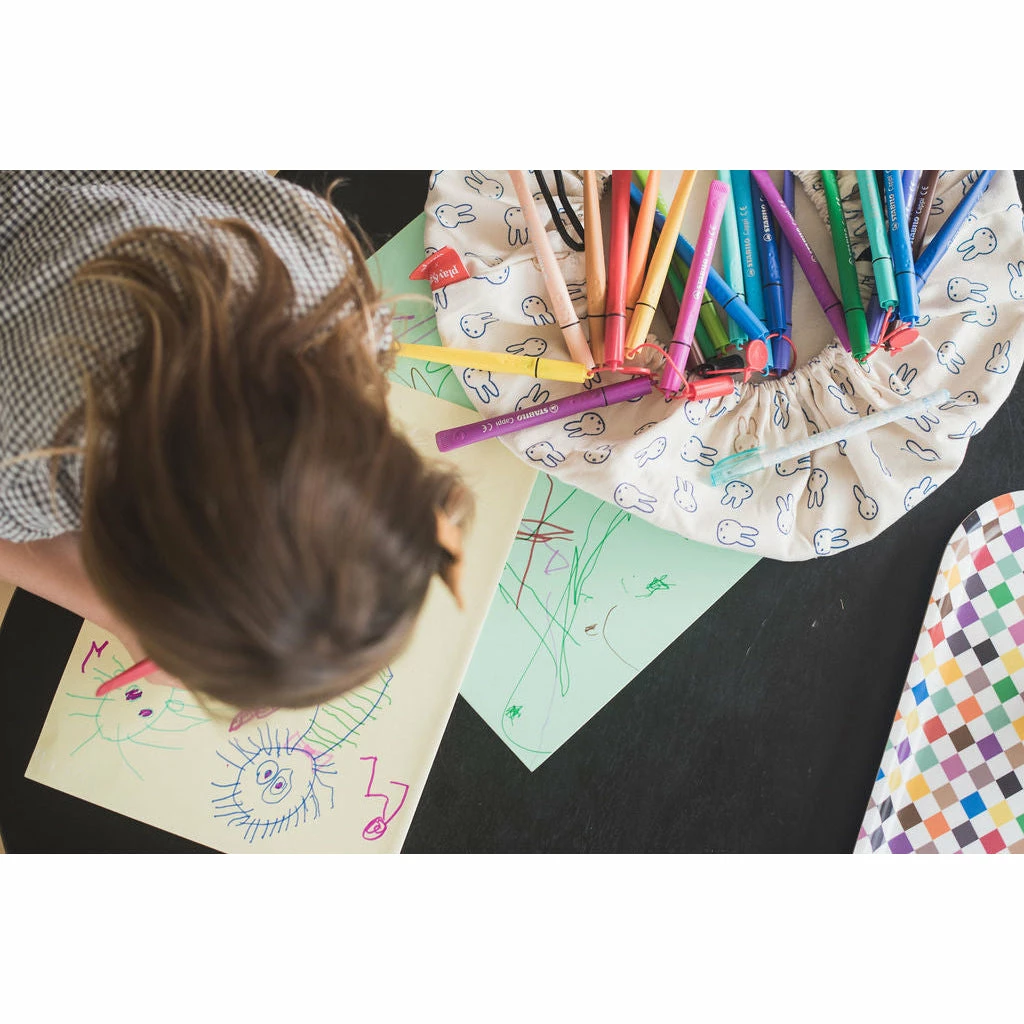 Discover the cute Miffy Mini storage bag from Play&Go! A fantastic collaboration between Play&Go & Miffy, to celebrate Miffy’s endless playfulness and curiosity and inspire your child to do the same. Miffy always loves play, adventures and exploring which makes her the perfect playtime companion in our eyes. The Mini Miffy bag can store all your favourite little toys, bricks and blocks and make it easy to carry it from room to room. Don’t worry about the mess: once you open the Mini bag, the rim prevents stuff from spilling out. It’s also great for arts & crafts materials, large enough to hold all kinds of pencils and markers. When it’s time to go, simply pull the strings and everything can be neatly put away. Details Mini Storage bag | One side printed with Miffy | Ecru cotton colour inside Composition 70% Cotton, 30% Polyester Dimensions Diameter 40cm