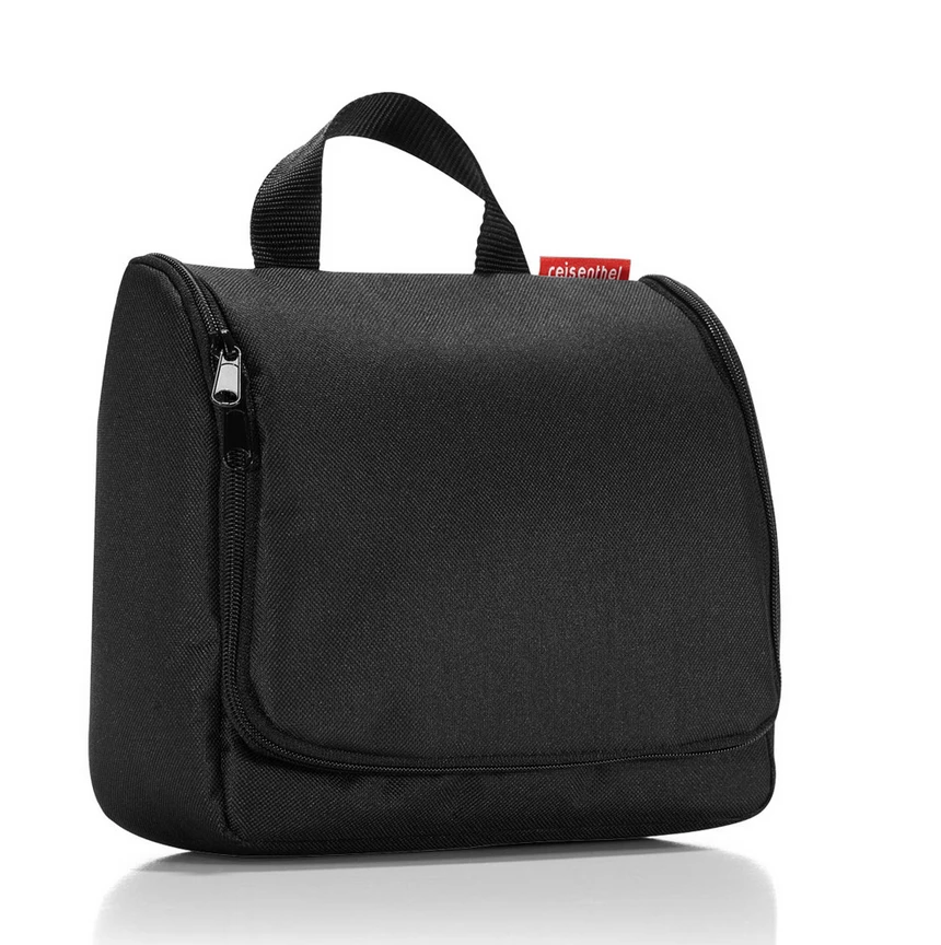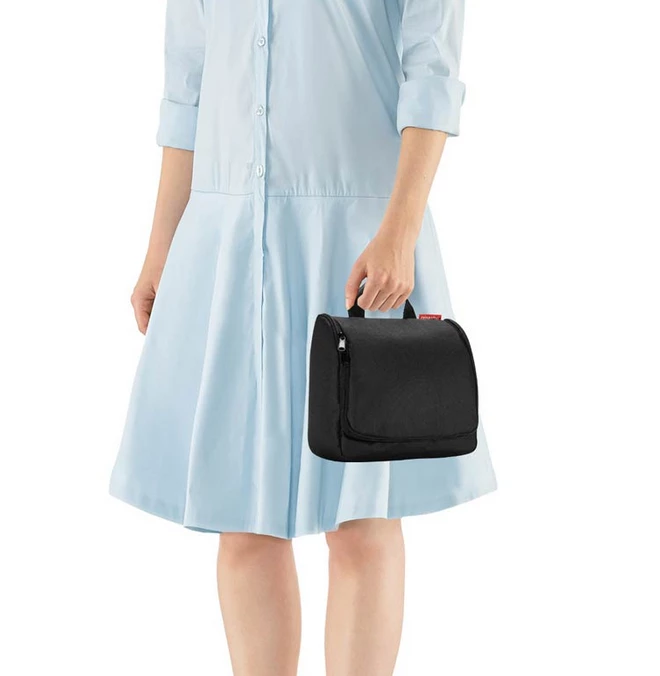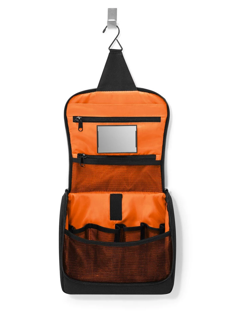 Reisenthel’s Cosmopolitan Black Toiletbag. Simply unfold and hang up – lots of space for tubes and bottles. The detachable mirror is a handy extra. The inside fabric is a bright orange.
