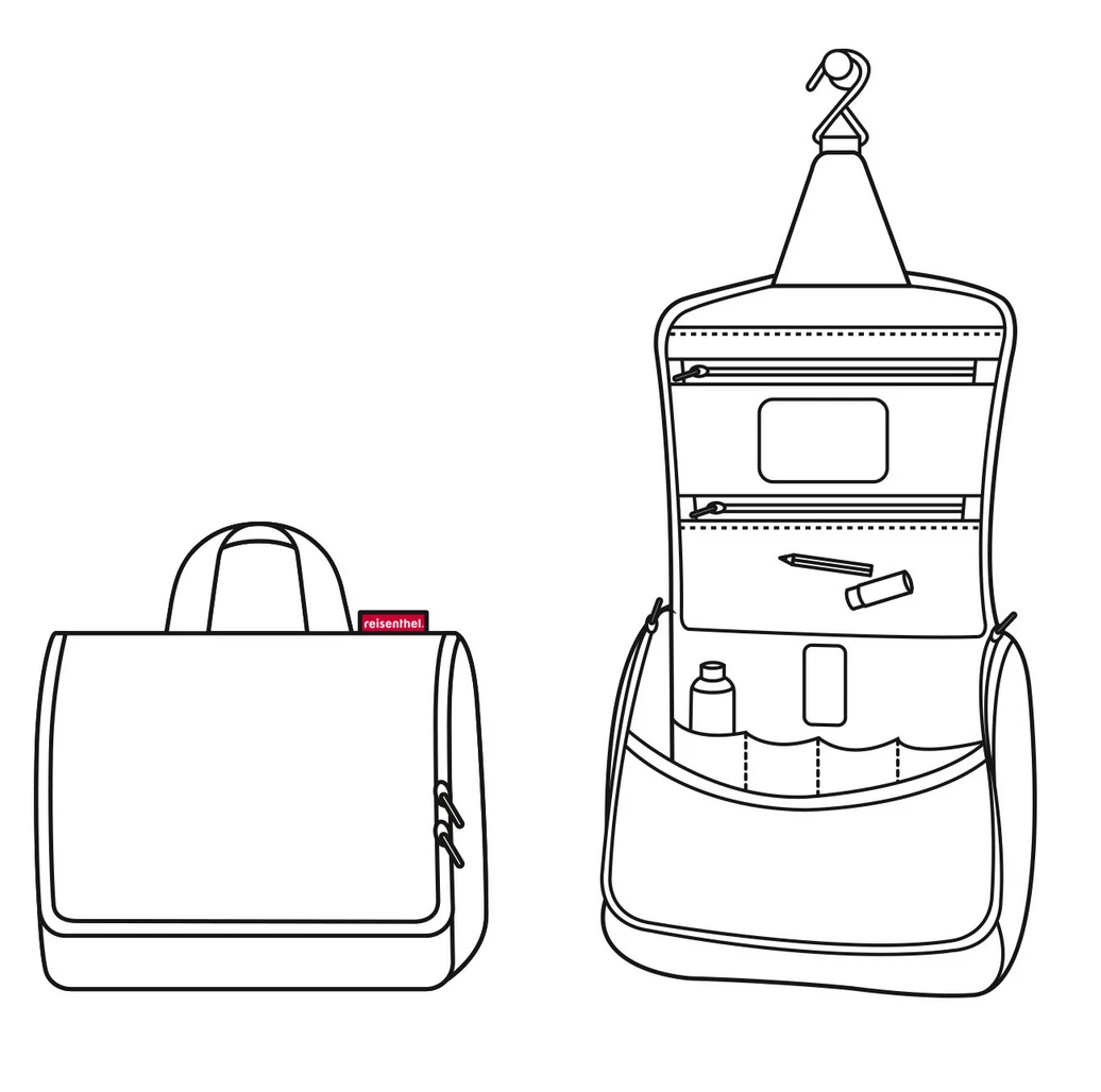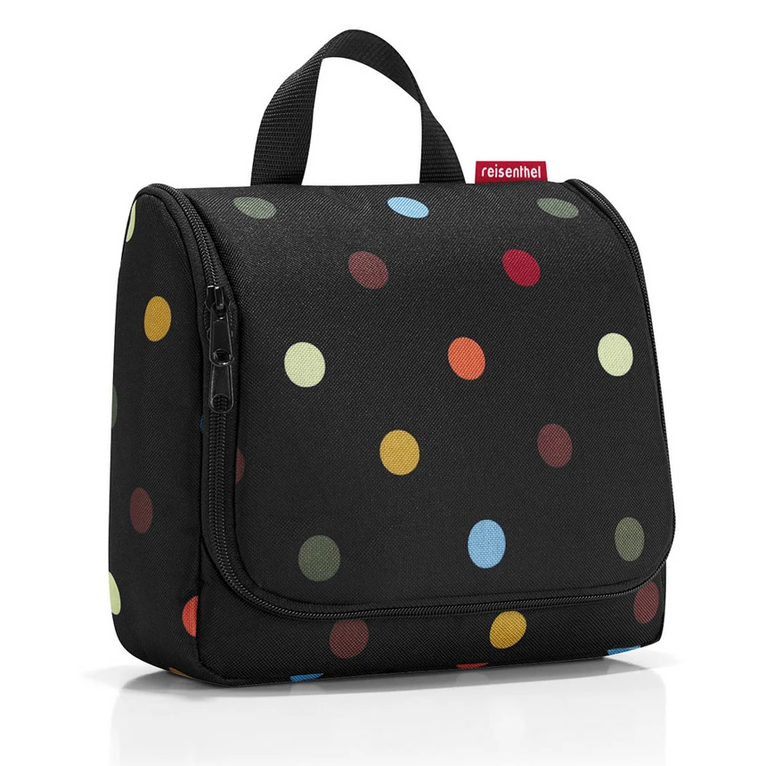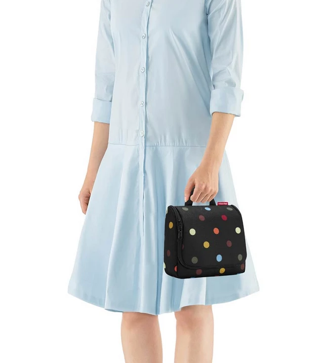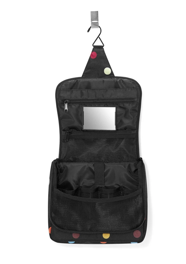 Reisenthel’s Cosmopolitan Dots Toiletbag. Simply unfold and hang up – lots of space for tubes and bottles. The detachable mirror is a handy extra.
