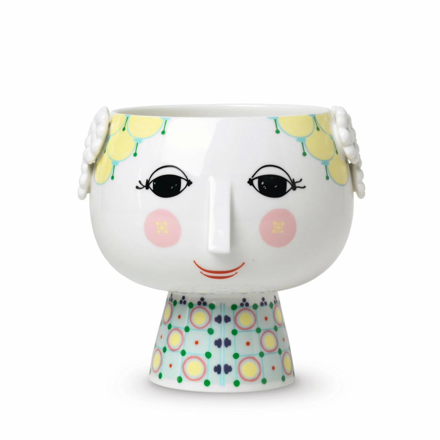 Introduce a subtle touch of 1970s nostalgia to your decor with a Wiinblad porcelain flower lady. Eva, with her vibrant dress in yellow, coral and sky blue, the pattern – taken from Wiinblad’s own drawings – is a reinvention of the designer’s original colourful interpretation of the smiling Eva.The glossy porcelain pot and decorative floral relief embellishments make this an extra special pot for your plants or just for decorating your home with love and character.
