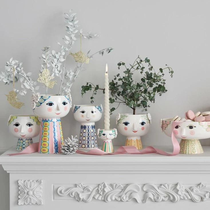 With a skirt-like base in cool blue, yellow and coral, this delightful vase is perfect for today’s eclectic decor and for careless bouquets of flowers that embrace the idea that more is more.